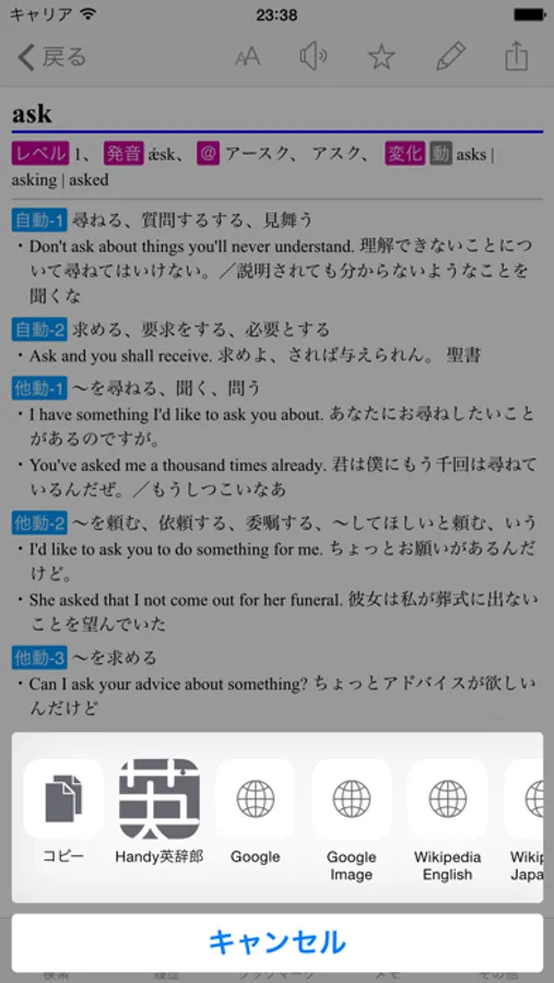 【Safariとの連携】SafariのアクションメニューからHandy英辞郎をタップすることで選択した単語の解説を表示できます。