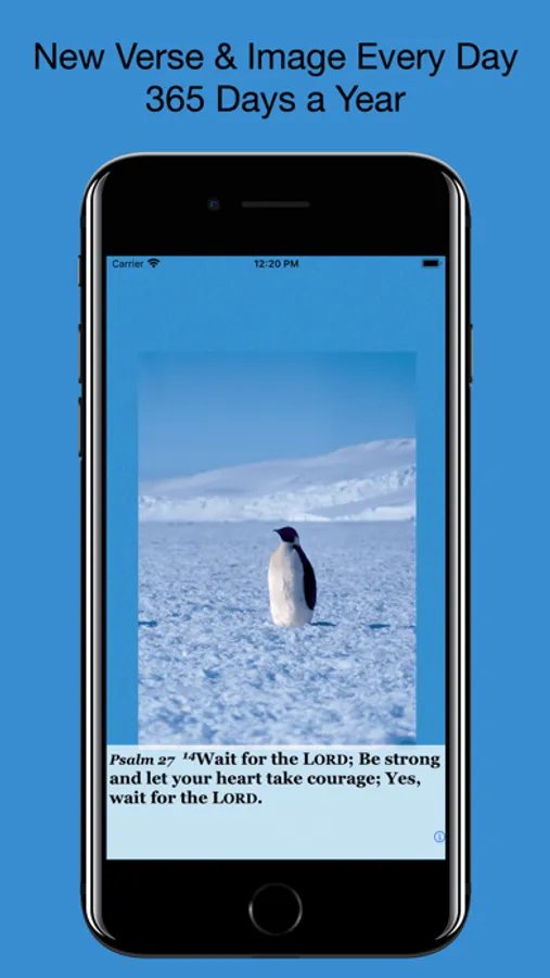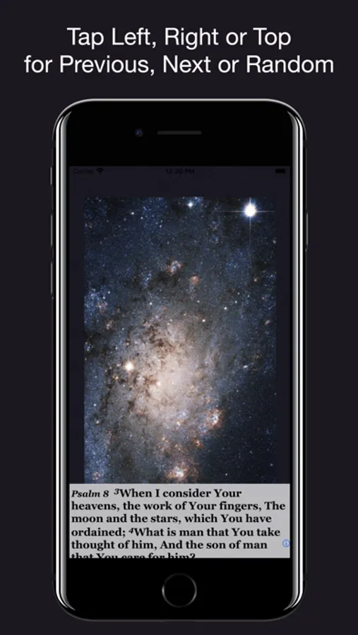 Easy to use! The simplicity of Psalm Daily Quotes allows you to focus on the words of scripture without distraction. The day's verse is displayed upon launch. Scroll up for longer verses. For browsing the collection of 365 images and verses, touch mid-right to advance one day. Touch mid-left to go back one day. Touch top of image for random verse. Touch "i" for help and other features such as sharing via Facebook or email.