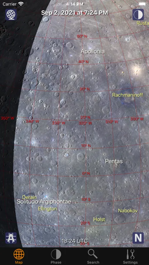Using the latest imagery consisting of a global mosaic of this elusive world, Mercury Atlas displays the phase and central meridian of Mercury from your chosen location and time. The feature database contains over 320 currently named features and is searchable.