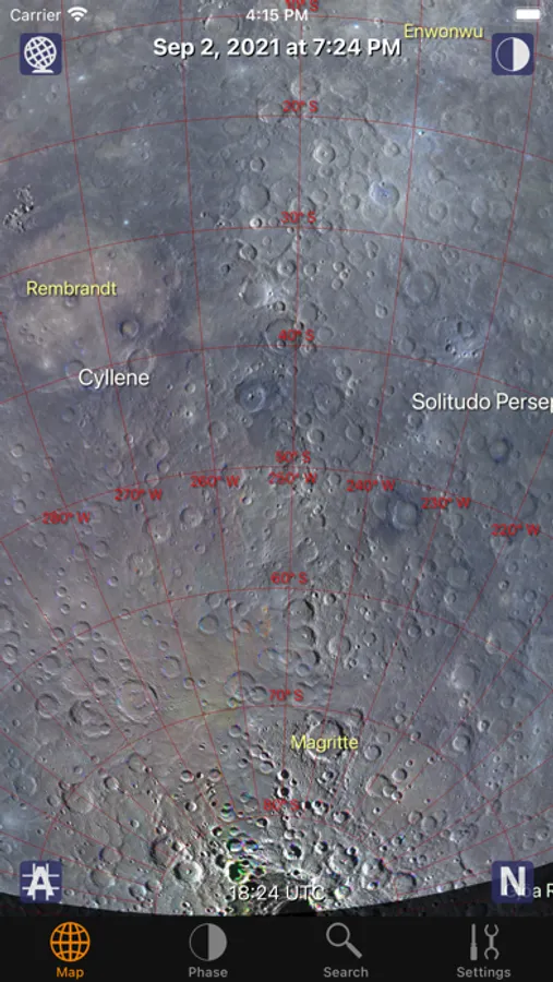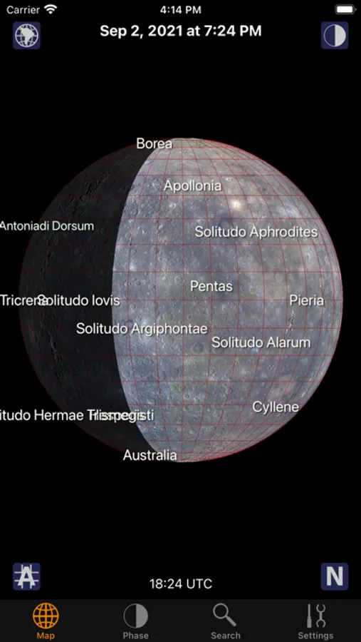 The Mercury globe can be shown with north or south at the top or inverted to suit different telescope views and the phase can be switched off to show the whole globe more clearly.