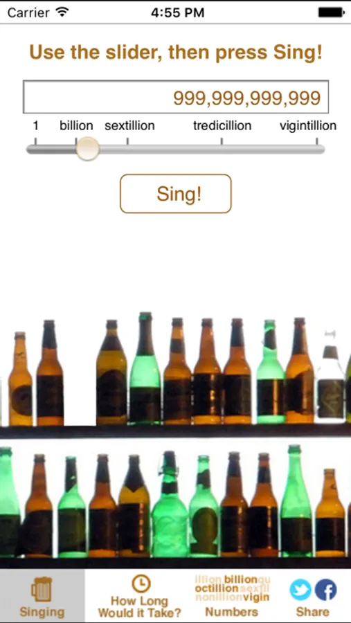 How long would it take to sing "A Trillion Bottles of Beer on the Wall"??? This hilarious entertainment app will sing "99 Bottles of Beer on the Wall" STARTING AT ANY NUMBER UP TO 1 VIGINTILLION (1,000,000,000,000,000,000,000,000,000,000,000,000,000,000,000,000,000,000,000,000,000), and will tell you how long it would take to sing it. Just listen or sing along - you and your friends will crack up listening to the absurd countdown!