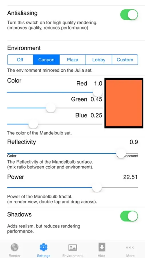 Double/Triple tap and drag the finger horizontally or vertically to change the shape of the Mandelbulb fractal. You can also set these constant in the Settings tab. The Settings tab also allows to enable an environment that is mirrored on the Mandelbulb fractal. The accuracy of the fractal surface can also be set here. If you have red-cyan glasses available, you can see the fractal with real depth by enabling stereo mode.