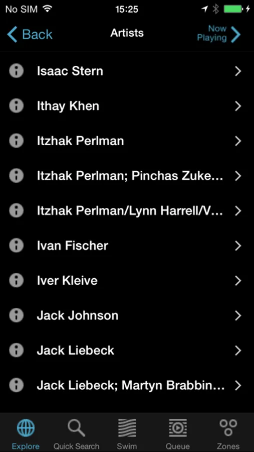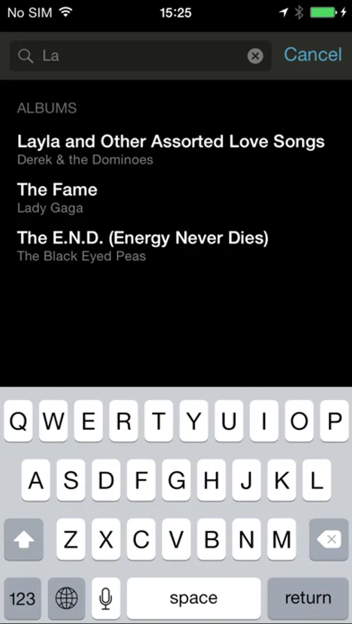 Quick search allows you to enter text using the on-screen keyboard, and displays album and track results as you type.