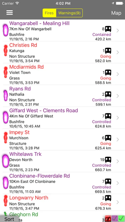 Using this information the application is able to provide a list of fires showing the nearest ones first, helping you to understand your current situation.