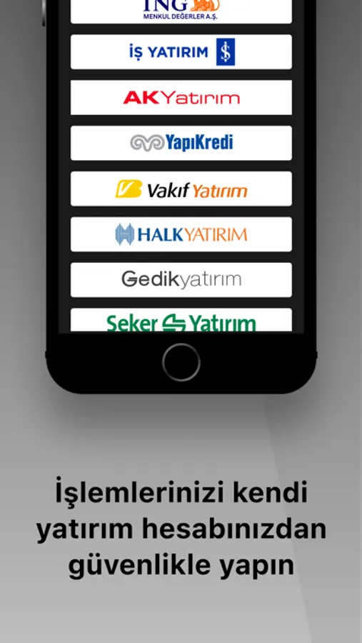 Ayrıca, önde gelen bankaların yanı sıra Gedik, Marbaş Menkul Değerler, Bizim Menkul, Turkish Yatırım ve daha pek çok saygın aracı kurum ile anlaşmalıyız. İşlem yapabileceğiniz diğer kurumların tam listesini uygulama içinde bulabilirsiniz.