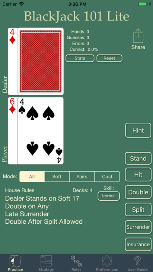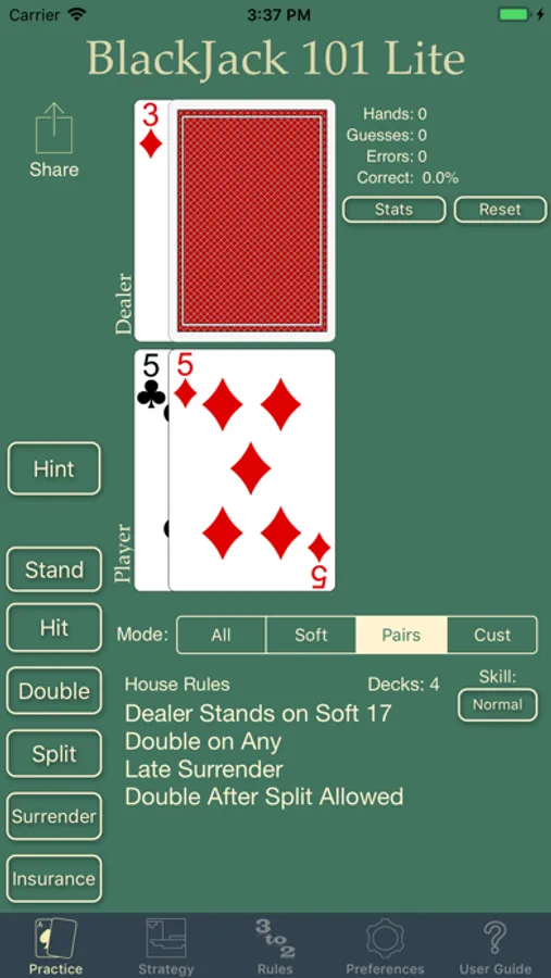 - Customize the house rules: number of decks in the shoe, hit vs. stand on soft 17, doubling rules and surrender