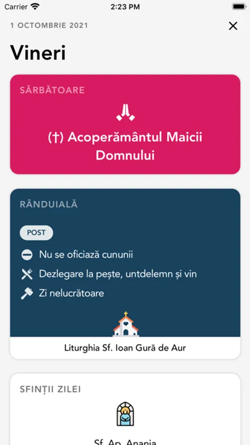 • rânduieli bisericești (zilele de post și posturile de peste an, dezlegări de la post, zile aliturgice, zile în care nu se fac nunți și parastase)