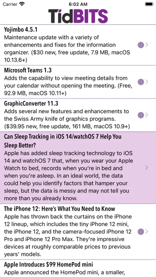 Displays headlines and summaries for the most recent TidBITS stories. At the top of the headline screen, pull to refresh the list.