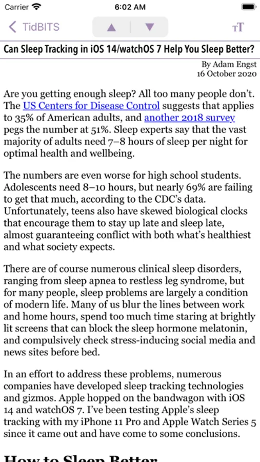 Tap to read the full text of any recent TidBITS article, complete with graphics and embedded movies. Choose among font sizes for reading articles.