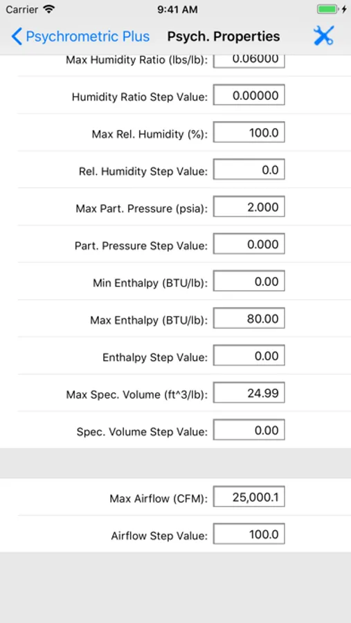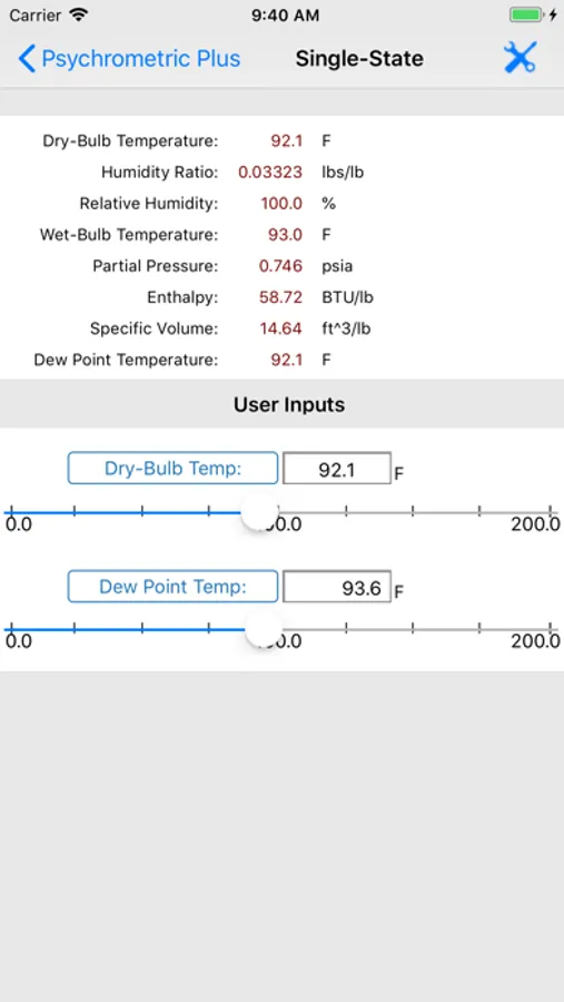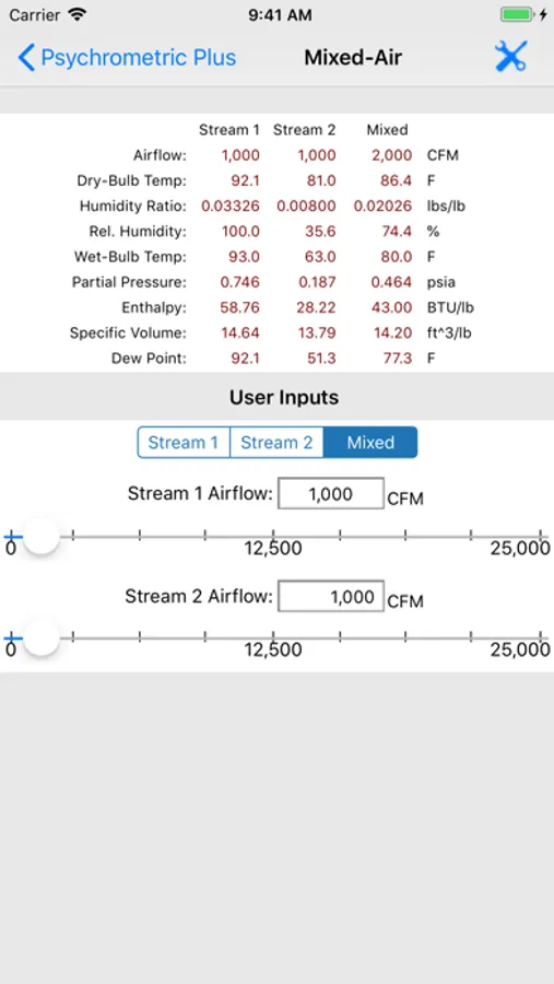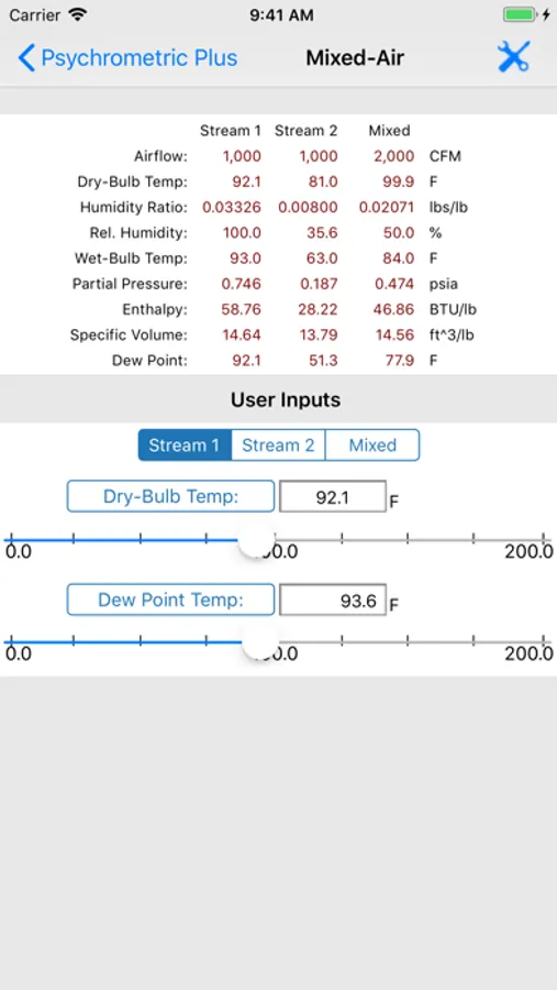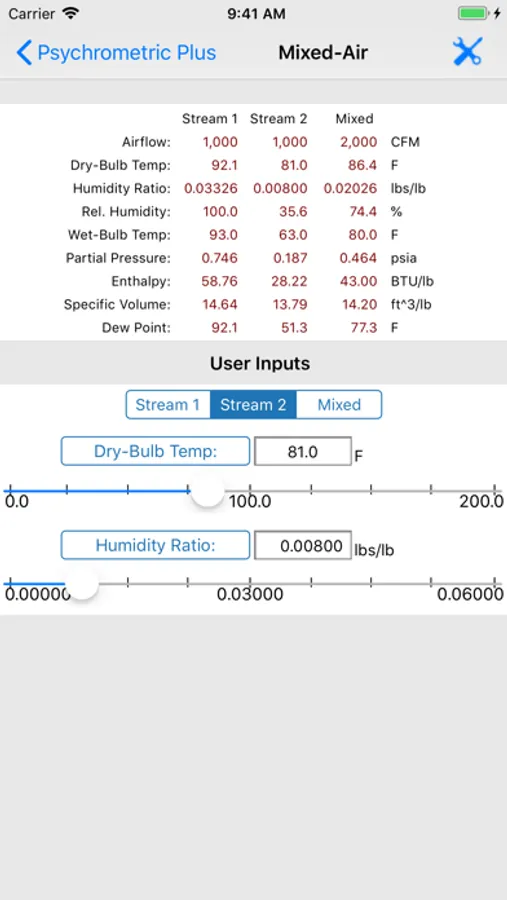 This application contains two separate input modes. The 1st input mode is the "Single-State" mode that allows you to specify 2 psychrometric parameters for a single stream of air and view the remaining 6 calculated values. You can quickly toggle through 23 different combinations of the 2 input parameters and instantly view the calculated results, all on the same screen.