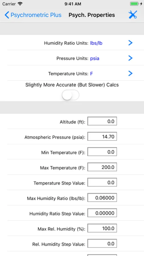 You can specify additional parameters such as the altitude of the air being analyzed, the atmospheric pressure, different types of units such as degrees F or R, and English or Metric units.
