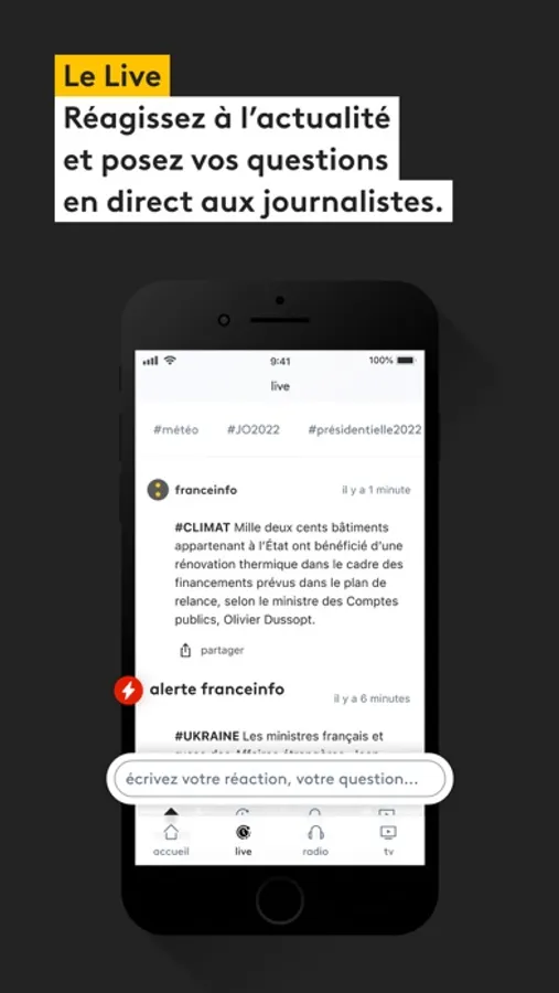 • Live : suivez l’info en continu toute la journée avec le live, réagissez et posez vos questions à nos journalistes qui vous répondent en direct.