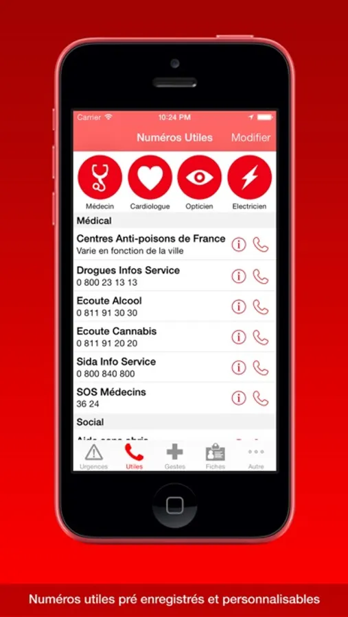 • Vous trouverez également dans cette application des numéros utiles préenregistrés :