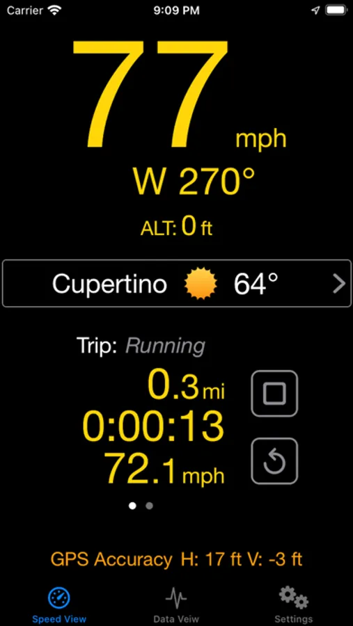 - The Speed View shows your speed, heading, course, altitude, odometer, trip and drive details. It also shows the current and next 24 hour weather conditions. Your current GPS accuracy is displayed at the bottom.