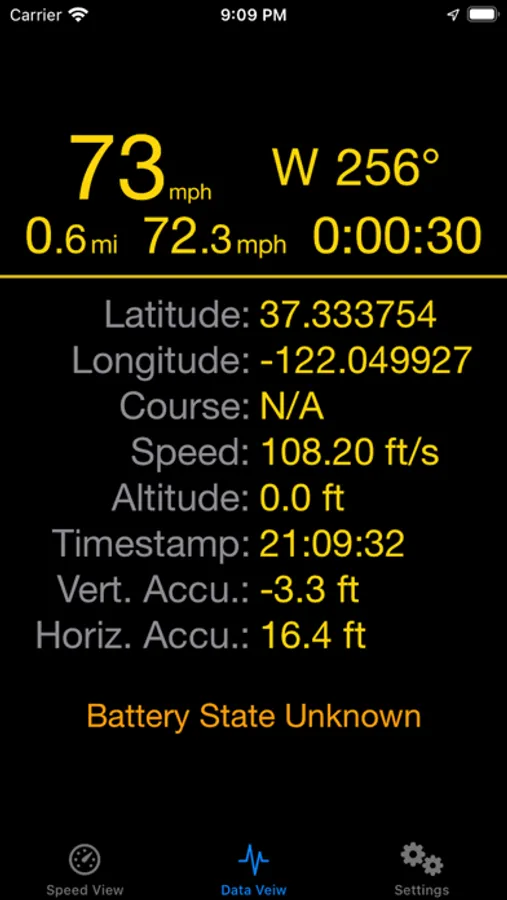 - The Data View displays the raw GPS location, speed, heading, trip data, and current battery status.