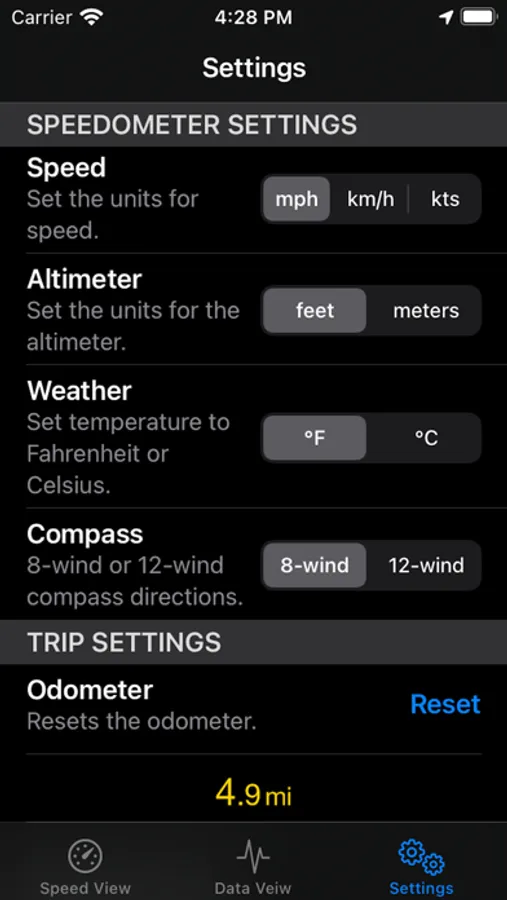 - The Settings View allows you to set the unit of measurement and compass winds.