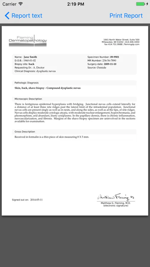 iDermpath is an app developed for clients of Fleming Dermatopathology. It provides them with instant, wireless access to their pathology reports. New reports are announced with an audible signal (via the Apple push notification service). Old reports are also accessible. Pathology slips can be created in several ways, using the virtual keyboard, camera, and/or microphone. The fastest, and a completely paperless, method is to photograph the patient’s face sheet and dictate information such as biopsy site. Clinical photographs can easily be included with the slip for clinicopathologic correlation. Photos and audio clips remain attached to the case, and are accessible via the lab’s website. iDermpath is secure and HIPAA-compliant. It has a demo mode for those who are not yet clients of the lab.