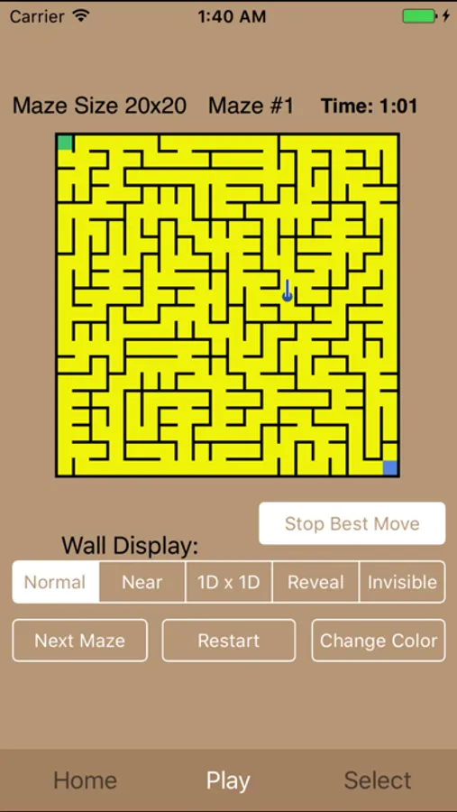 1) a 40x40 maze with the current position in the center and the 'Show best Move' feature used - Portrait view