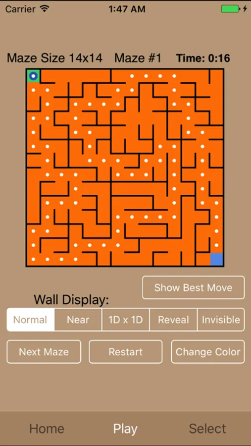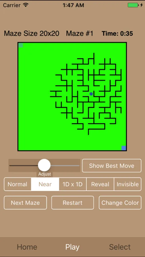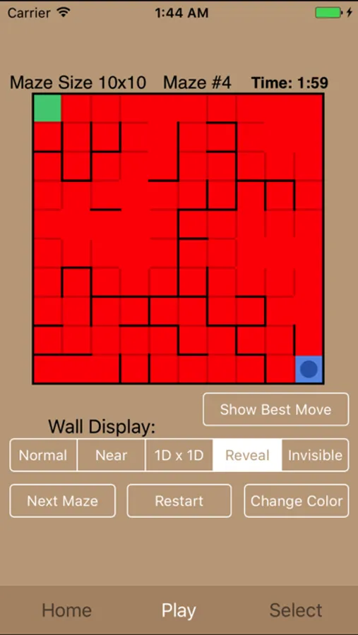 32 free 2-D mazes from 5x5 to 40x40 (iPad) or 6x6 to 20x20 (iPhone). Color and sound. Maze walls can be invisible, revealed upon touch, shown only along a horizontal and vertical line, shown only near your position, or fully displayed.