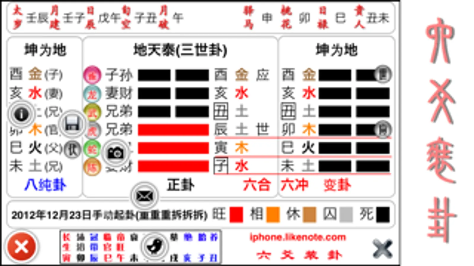 都说“装卦容易断卦”难,但是对于那些初学“纳甲预测”的人来说,装卦也并不容易,需要记很多东西,才能迅速把卦装好。如果不熟练的话,把一个卦完整装好,在纸上写下五行,六亲,六兽,伏卦和变卦至少也要十多分钟。“六爻装卦”程序使得装卦的步骤迅速缩短到几秒钟,你只要选择起卦日期,将每次摇卦的结果通过手指轻轻按动输入,然后点击“装卦”按钮就可迅速完成装卦工作。装卦后的信息包括:太岁,月建,日辰,旬空,月破,六亲,六兽,五行干支,以及可能出现的变卦和伏卦的五行干支信息。另外“六爻装卦”通过月建信息得出本月五行的旺相休囚死,并通过每个五行的文字颜色加以标注,使得五行旺相生克信息一目了然,极大地方便了预测人断卦。另外“六爻装卦”程序内置了“拍摄快照”的功能,你可以将装卦信息拍摄到 iphone/itouch 设备的照片库中,随时传输打印(装卦图底色为白色),配合 evernote 和邮件等程序可迅速将装卦图传给预测师加以断卦。