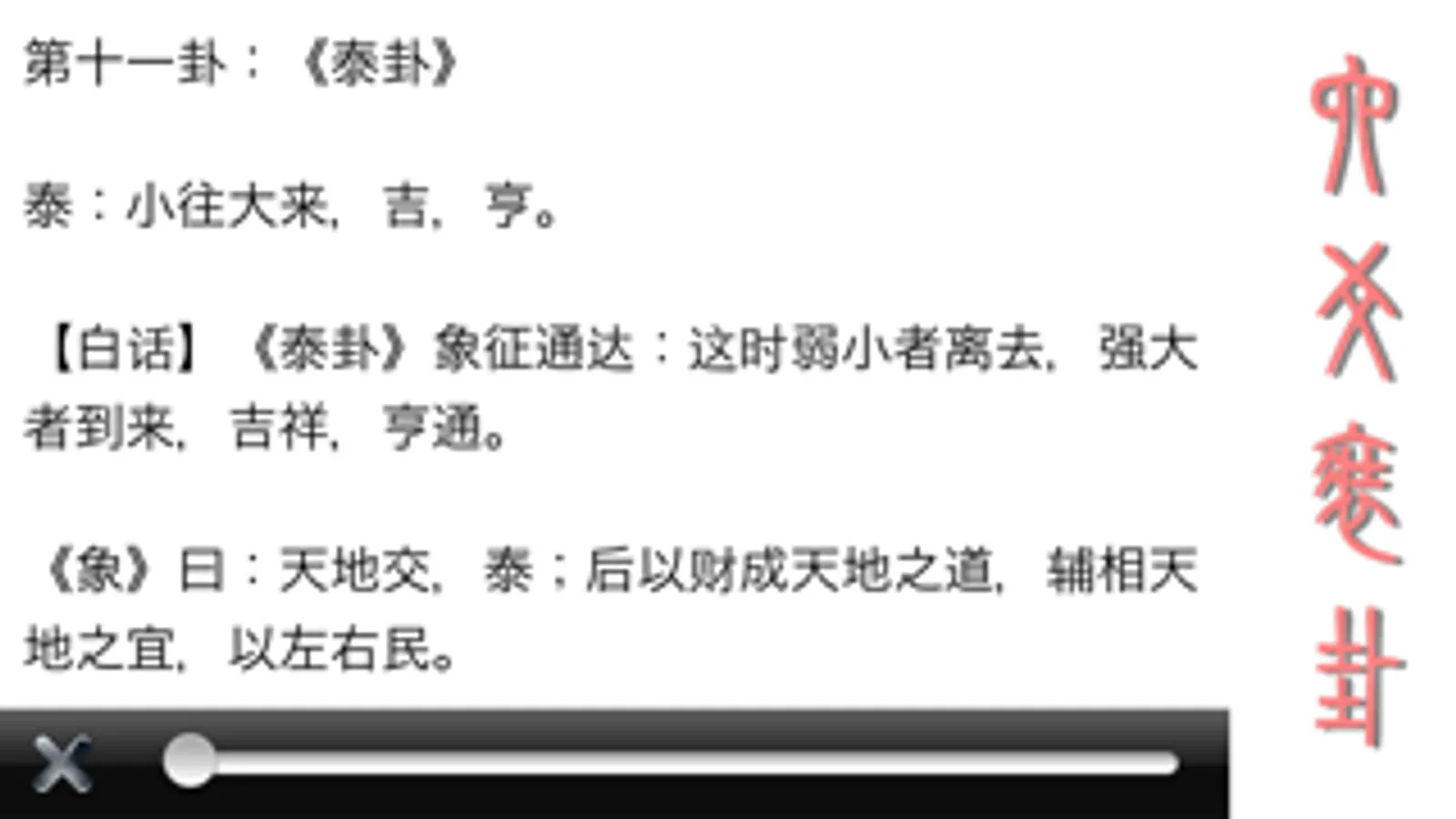 - 内置装卦图的说明,摇动钱币和拍摄快照的时候都有音效,形象生动。