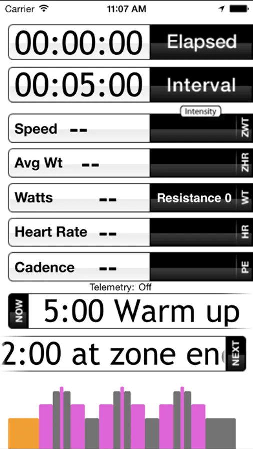 Displays current zone Heart Rate and Watts as calculated from threshold values