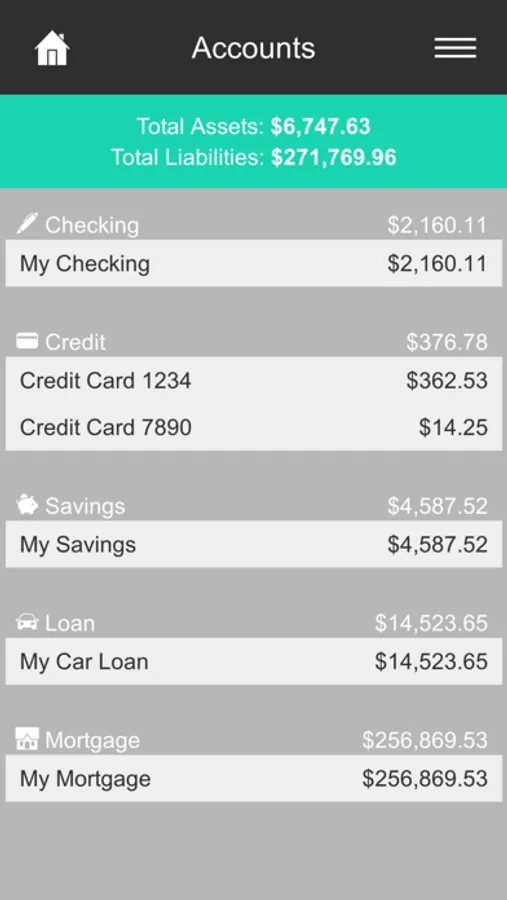 - Keep an active register of accounts of all types, including: checking, credit, savings, investment, retirement, loans, mortgages, and cash.