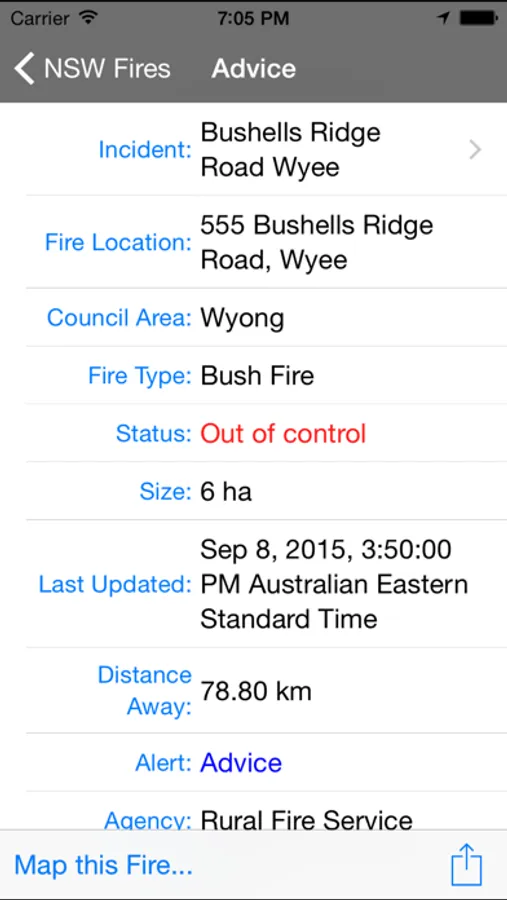 Using this information the application is able to provide a list of fires showing the nearest ones first, helping you to understand your current situation.