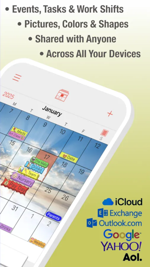 * iCloud, Google, Outlook, Yahoo, iCal Sync.