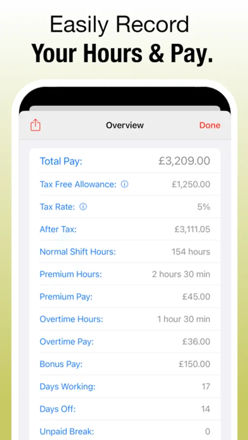 As well as allowing you to plan your future work & play, ShiftLife also allows you to easily maintain a record of your completed shifts, overtime hours, working locations, hourly pay, total pay, sick days and other details.