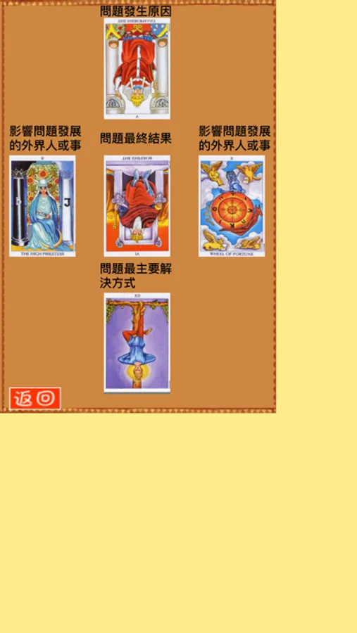 五、开牌。点触每张牌,会显示此牌的相关断语作为占卜结果。点触返回按钮则可以返回主界面选择其它牌阵。
