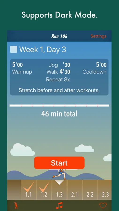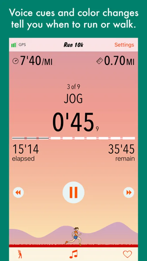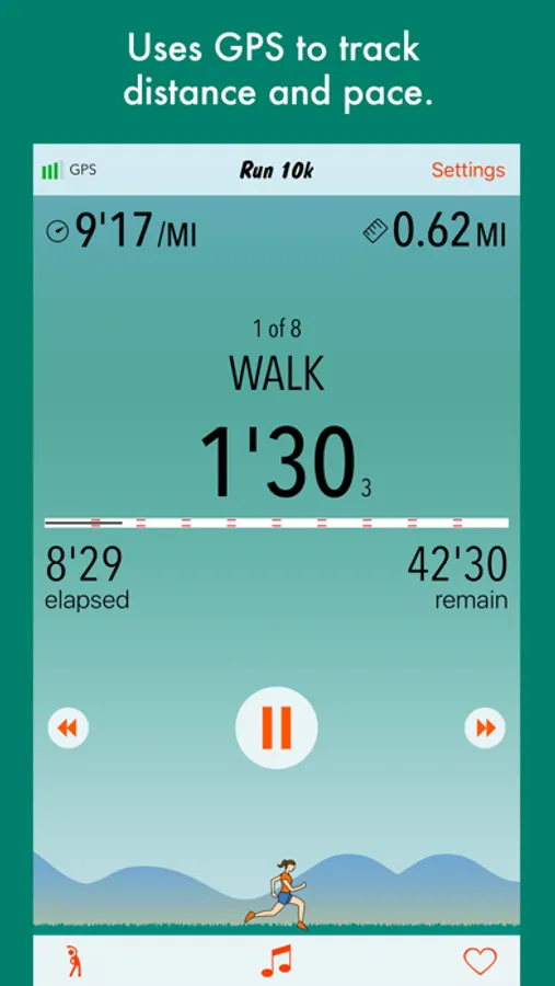 • Speaks each jog and walk interval, the halfway mark, and 1-minute-left mark.