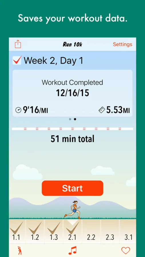 • Automatically checks off each completed workout and records your date, pace, and distance.