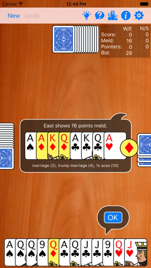 Full-featured, ad-supported pinochle app for iPhone and iPad. Play single- or double-deck with configurable options including meld bids and shoot the moon. Pinochle is updated frequently with user-suggested features and AI improvements. Also available in the App Store is a paid version with NO advertising: Pinochle Gold.