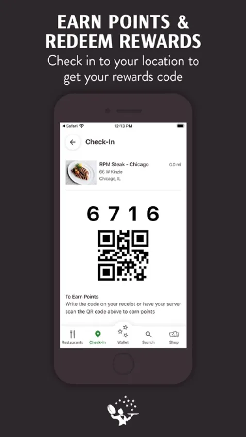 Check-in: Check in to Earn points & redeem Reward Dollars: Tap check-in and select the restaurant where you are dining. You will receive a 4 digit code that you can write on your receipt or a QR Code for scanning. You can also now check-in from your upcoming reservation on the home screen.