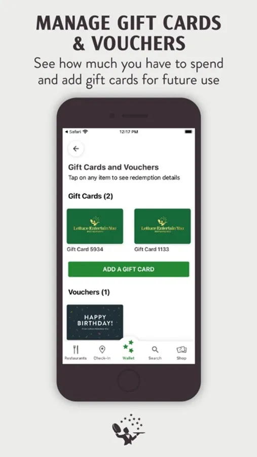 Add a Gift Card or Holiday Bonus: Tap the “Add A Gift Card” button, enter your 16-digit number (and 8 digit pin if you have one), then tap save card. Your Gift Card will now be accessible to redeem in your Wallet with your other rewards and vouchers.
