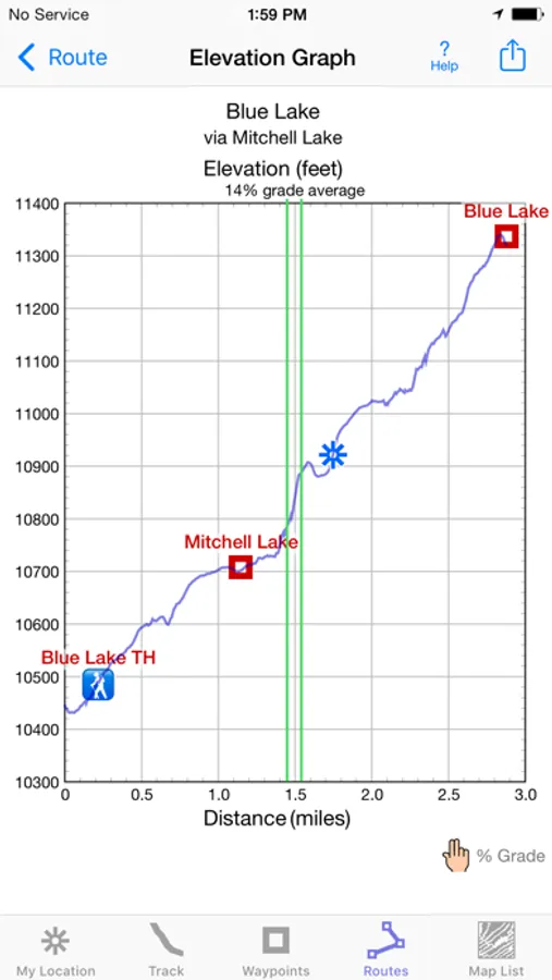 View elevation graphs of your tracks & routes. Show date, time, average speed and % grade. Measure the area inside a closed path.