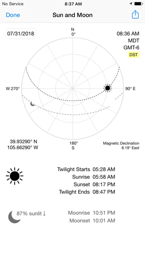 View the sun & moon position, rise times, & set times for any date & place on earth.