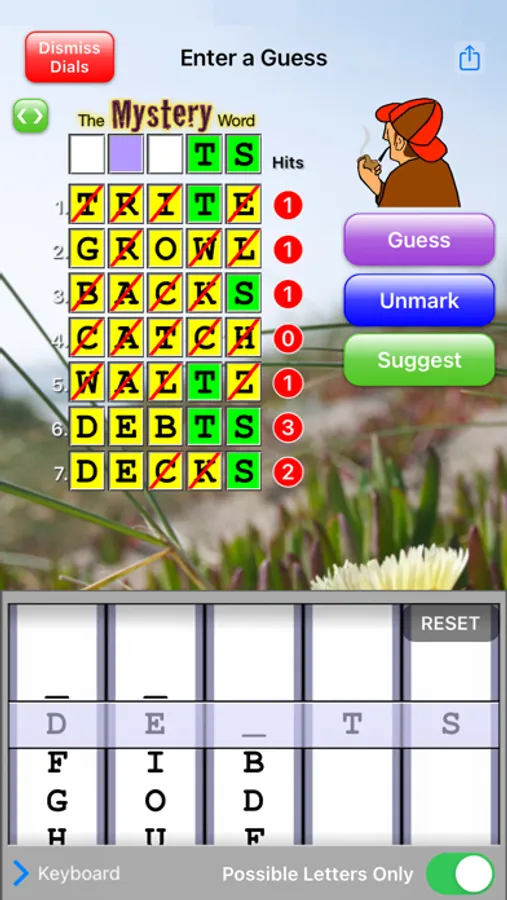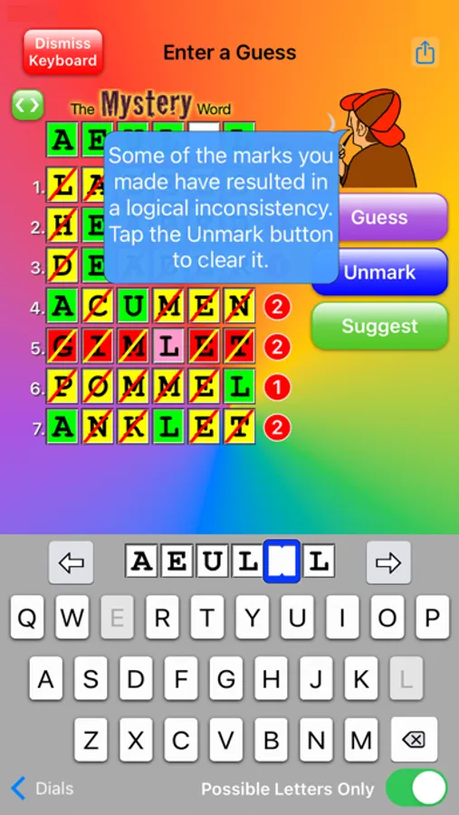 7. A polished user experience with improved marking and simpler game play. Use letter dials or a keyboard to enter your guesses. On an iPhone, enlarge guess list for easier manipulation. Reorder your guesses to see more potential patterns. Having trouble thinking of words? Use the Suggest button! Need advice about your game play? Tap on Sherlock for tips and encouragement. And check out the help info to learn about letter frequencies and common suffixes.