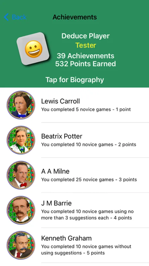 3. Game Center integration. Statistical results, scores, and saved games are associated with the active Game Center player. If you are not logged into Game Center, you may supply your own player name for separate game tracking, or play anonymously. If you use Game Center, scores are reported to Classic, Novice, and Puzzle leaderboards. A Champions leaderboard ranks the overall quality of your play over time. Achievements may be earned based on the quality and persistence of your game play. As you earn Deduce achievements discover 50 19th century literary giants of the western world, who were also masters with words. A portrait medallion, with a biography link, is awarded for each achievement -- collect them all!