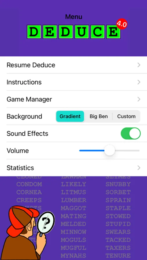 3. Mystery Word definitions. When you finish a game of Deduce, a definition of the mystery word is provided. Increase your vocabulary as you play more games. Definitions come from’s Apple’s downloadable dictionaries or Wiktionary, whichever is available.