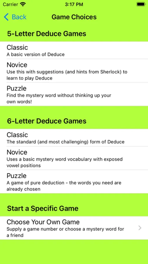 2. Comfort level - Deduce can be as easy or challenging as you like, with optional features to assist your thinking. Play with easier 5 letter words or more difficult 6 letter words. NEVER ANY ADS TO DISTRACT YOU!