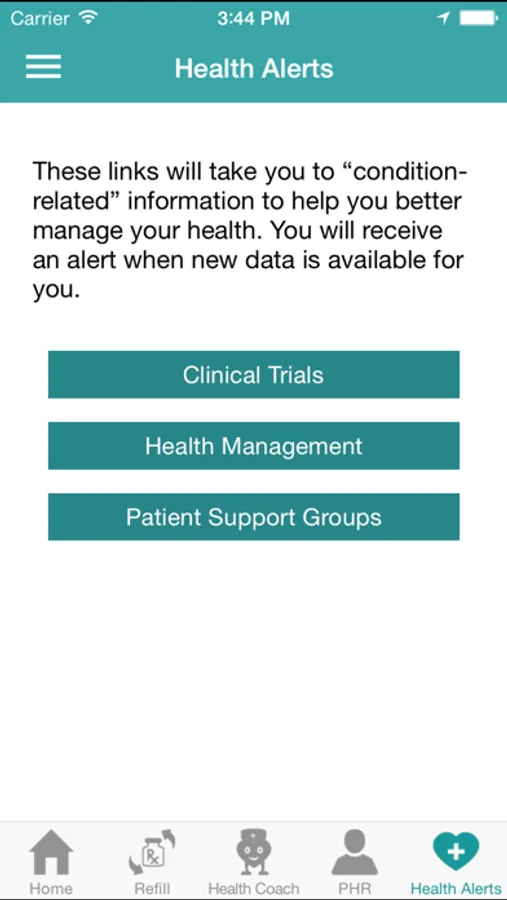 HealthAlert is the function that connects them to various web addresses that 1.) Have condition-related information or appropriate links on how to better manage their condition, 2.) Connect to condition-related dialogue forums, 3.) Connect to condition-related information on clinical trials, or 4.) Connect to a condition-related chat room.