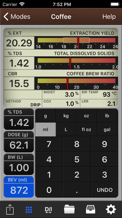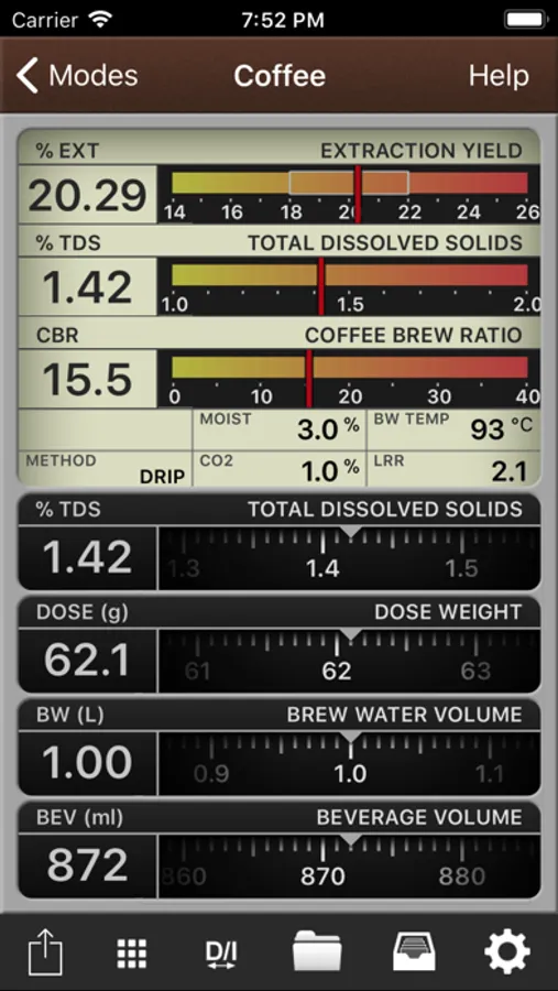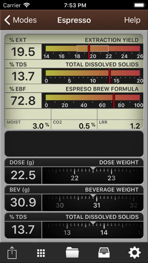 •Save, share, import measurements and details, including TDS, Ext Yield, Dose, Brew Formula, CO2, Moisture, Brew Time, Brew Method, Temperature, Pre-Infusion, Grinder/Setting, Roaster, Roast Style, Farm/Farmer, Barista Name/Notes and much more.