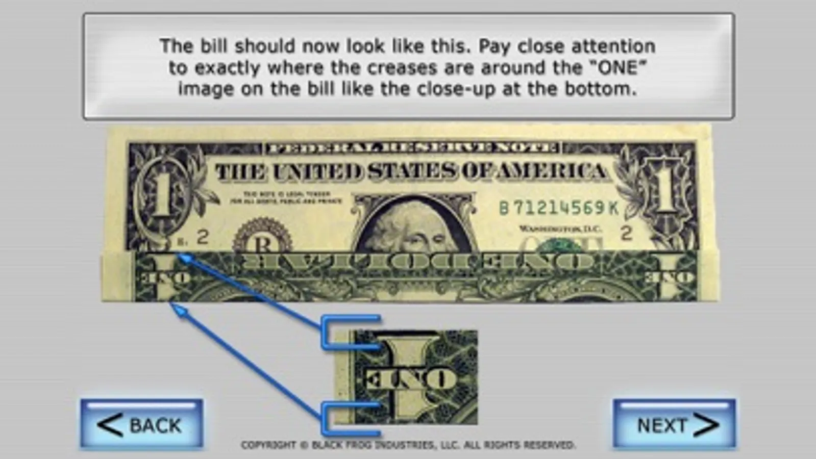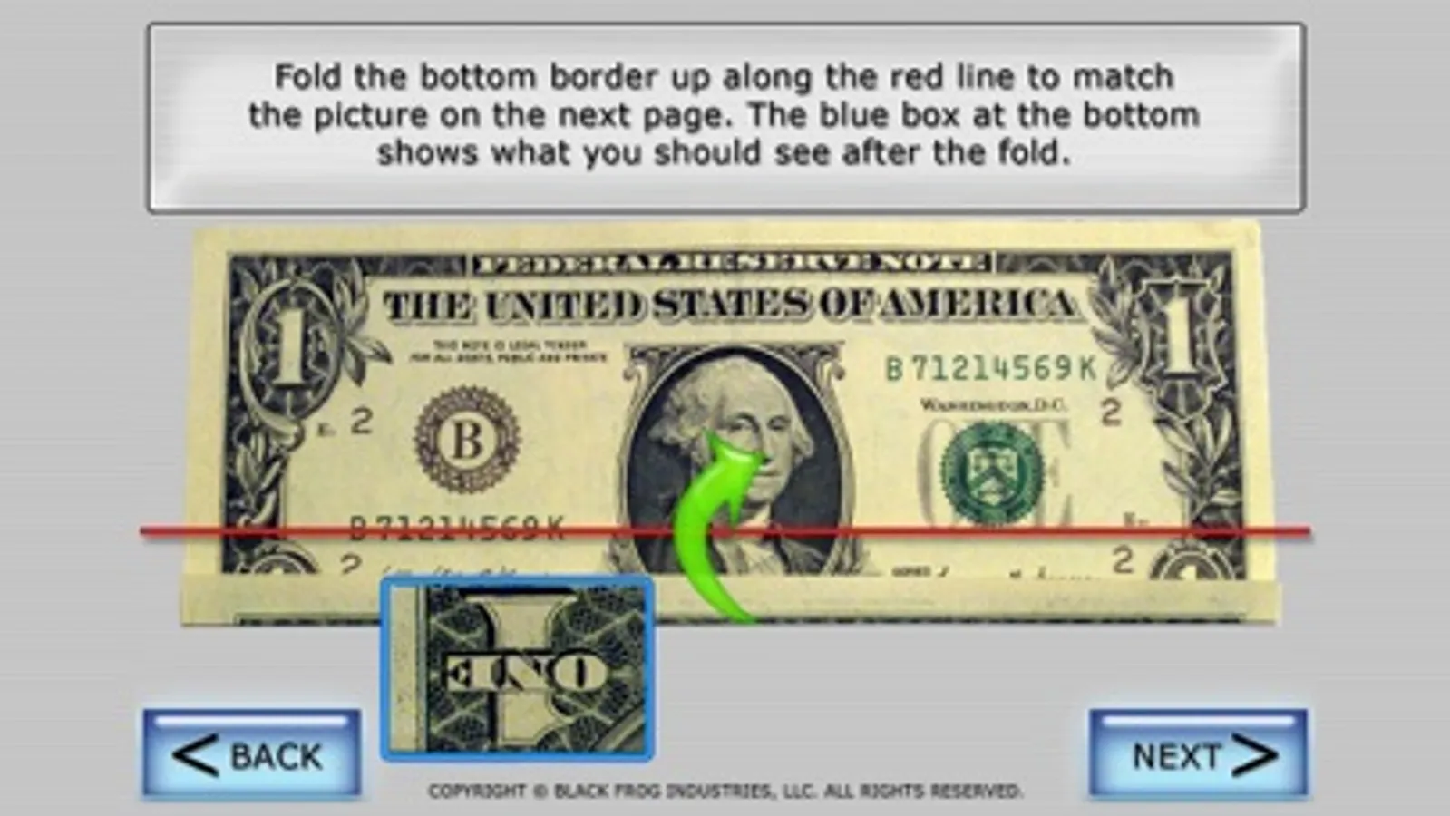 You can even use non-US money! Each of the 32 steps has one or more high resolution photos, instructional text, and colored arrows and lines to show you how to fold the bill. You can go forwards and backwards just like an e-book! This is a great way to spend time in a waiting room or on an airplane!