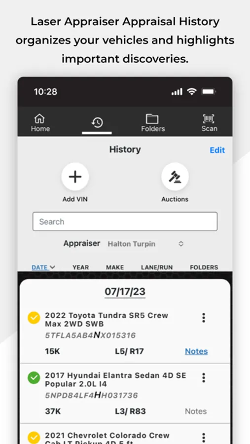 VIN Scanner is designed for car professionals to remotely access the Laser Appraiser vehicle valuation solution. Instantly access industry guidebooks like J.D. Power (NADA), Black Book, Manheim Market Report, Kelley Blue Book, Galves, and more. Integrate Vehicle History Reports Carfax and Experian AutoCheck for FREE. In the lanes or on your lot, VIN Scanner delivers fast and accurate VIN barcode and VIN text scanning, manual VIN entry, and car drill-down using Year, Make, Model specs.