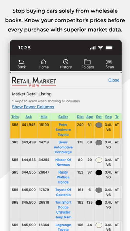 No hidden costs and no gimmicks... we don't give away one feature just to mark-up another. We appreciate transparency, which is what we offer you! Just scan a VIN and VIN Scanner shows you full wholesale and retail market data for the car or truck as well as local competitor inventory pricing.