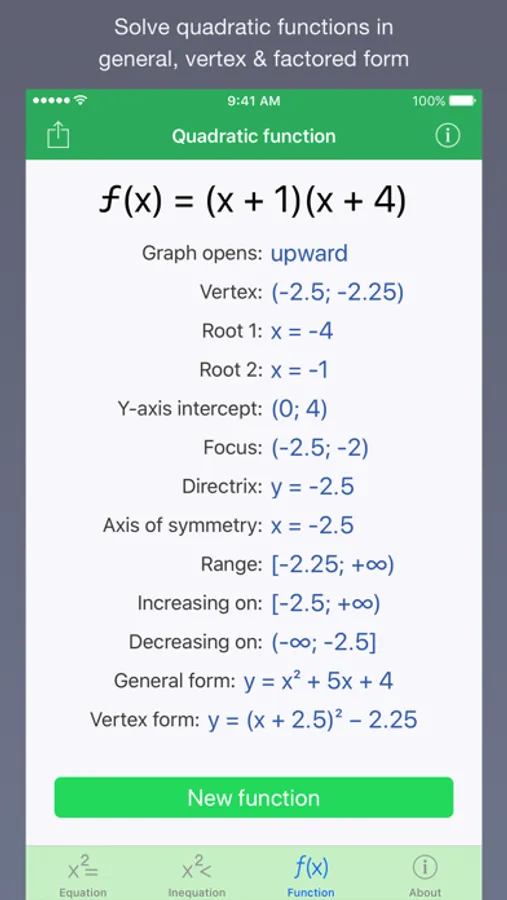 Quadratic Master is the best app for solving and learning quadratic equations, inequations, and functions on your iPhone.