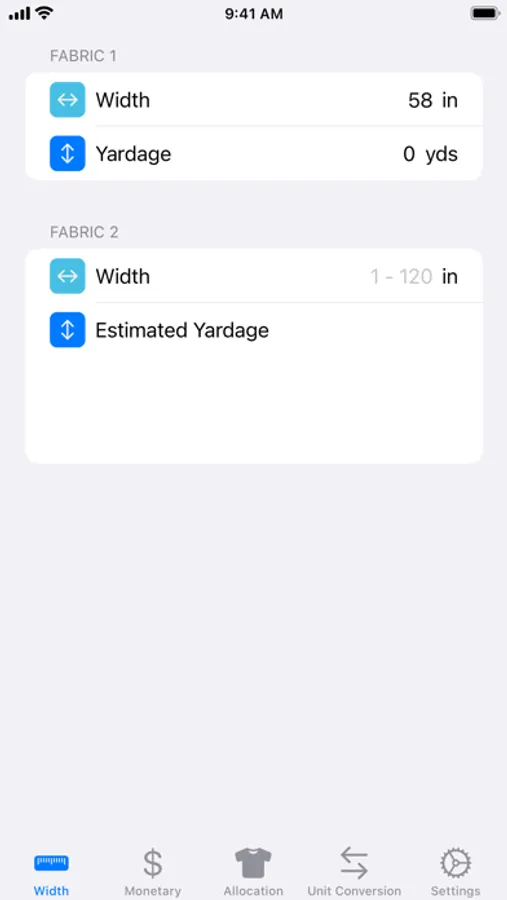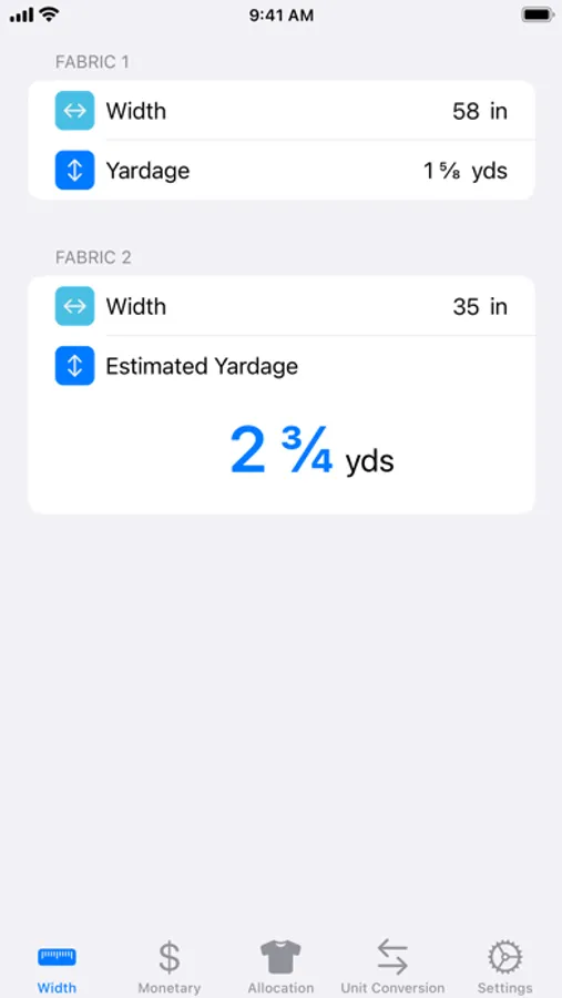 • Width Conversion – Imperial mode: Calculate yardage based on widths between 1″ to 120″ (in 1″ increments) and yardage between ⅛ yd and 100 ⅞ yds (in ⅛ yd increments). Estimated New Yardage can be toggled between decimal and fractional result rounded up to the nearest ⅛ of a yard by simply tapping the result.