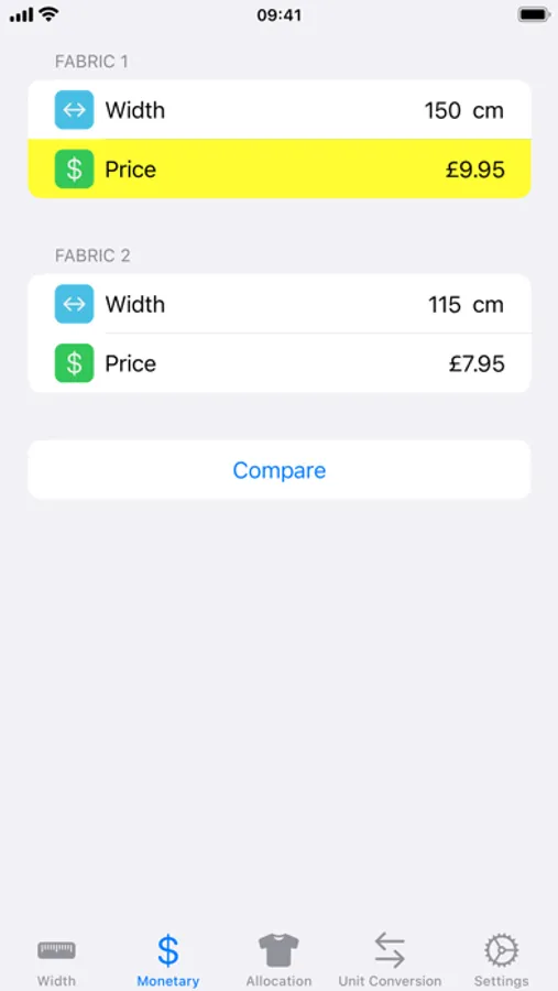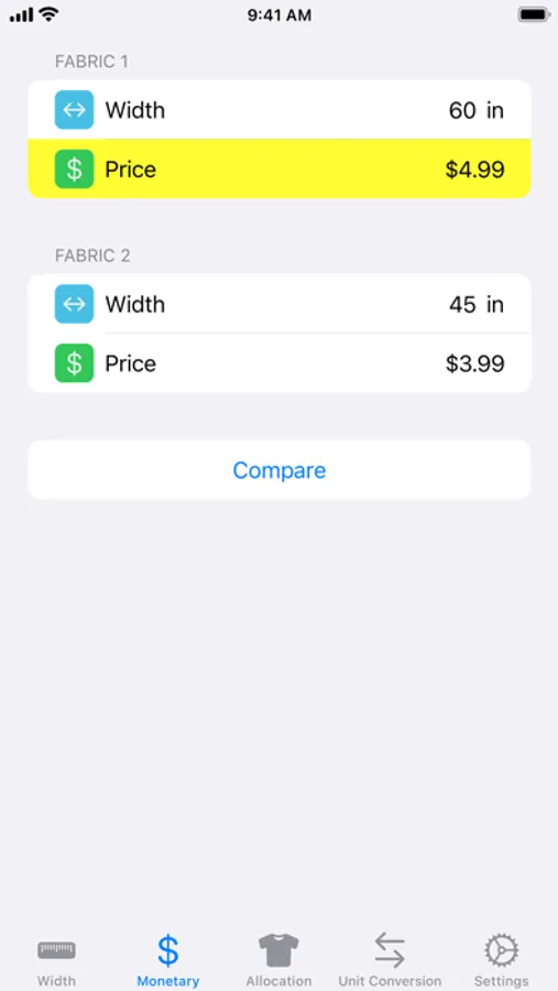 • Montary Comparison – Result: Highlighted price indicates fabric that is a better deal.
